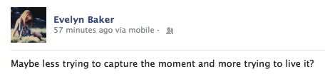 Which brings me back to my original thought.  We — or at least I — have gotten very into the habit of snapping pictures of things that strike my fancy and that I think would be interesting to share with others, via Facebook mostly, if I’m being honest.  That habit that I’ve gotten into of stopping while I’m in the moment to step out of that moment to capture it,  I think that very act kind of diminishes the experience somehow.
